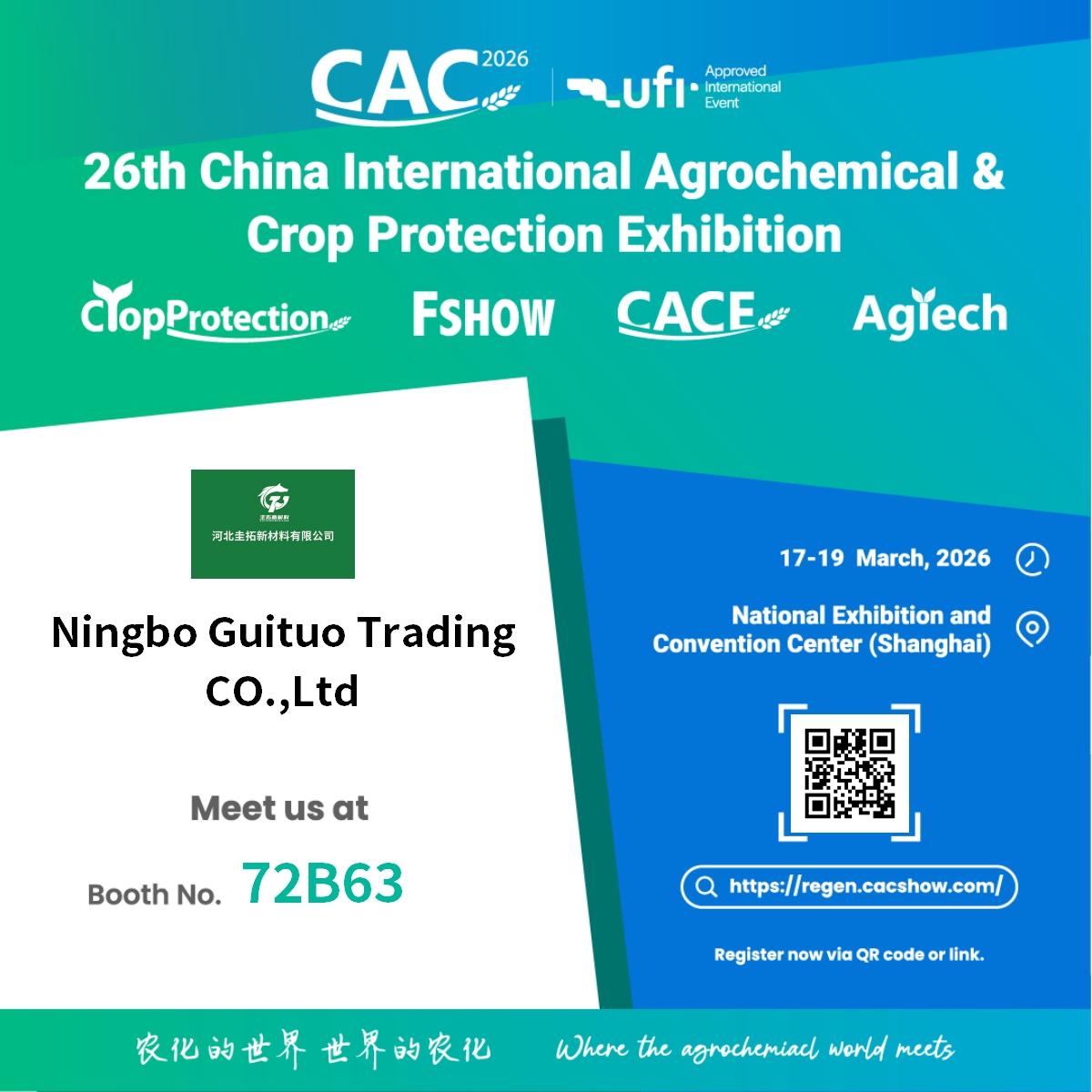 Ningbo Guituo Trading Co., Ltd. er stolte av å kunngjøre sin deltakelse i 26. China International Agrochemical & Crop Protection Exhibition (CAC 2026) . Denne prestisjetunge globale begivenheten vil finne sted fra kl 17. til 19. mars 2026 , på det nasjonale utstillings- og konferansesenteret i Shanghai.